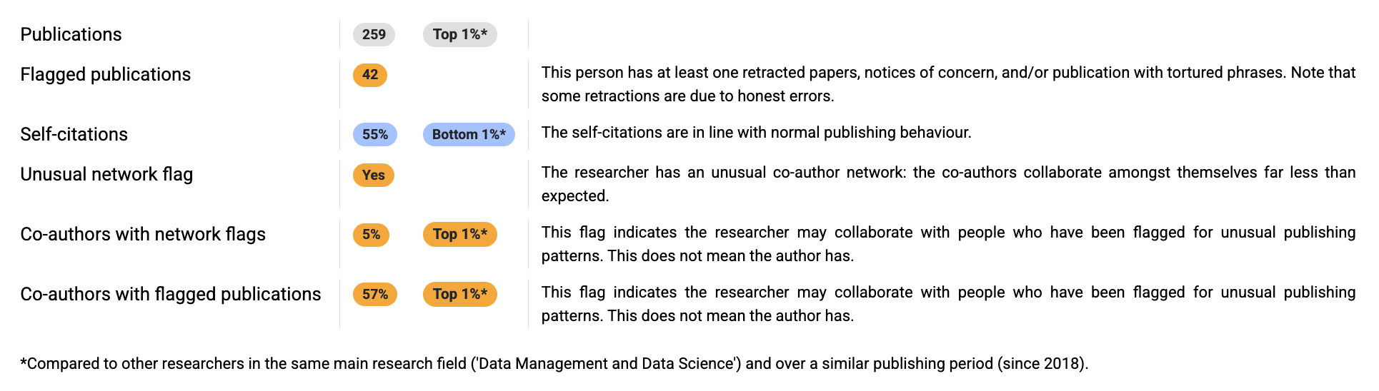 We now provide enhanced context for research integrity indicators in Author Check's Researcher Profiles. Broadly speaking, you will now see additional messaging that gives you more guidance when it comes to expected versus unusual behavior.